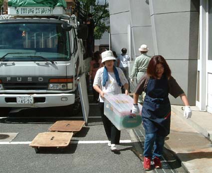 | ◆第72回例会「遥かなる甲子園」報告 9月13日(月) いまばり市民劇場 第72回例会 関西芸術座「遥かなる甲子園」がありました。 ★搬入は13時開始。 もう秋ですね。 管理人が会場にやって来た時にはトラックは・・ありました。これは・・・。 今どき、「ほろ」かぶってます。 学校公演にはこのサイズのトラックでナイトだめなんだそうです。 さー!搬入開始!絵柄が西部劇っポイ?それとも、お引越しですか・・って感じ? みなさん!がんばりましょう! 製作の柾木さんも働いています。 校長役、寺下貞信さん(左)↑ 中井佳代さん(一樹の母役)↑ 堀田さん 柴田さん これは!村崎由佳さん? 荷物も残り少なくなりました。 桑原さん 汗びっしょり ★関西芸術座6号発進!! 新兵器発見。これはどんな所でも?!公演する関西芸術座には強い味方!(折りたたみ自転車) 買い出しはお任せあれ! 寺下さん操縦の秘密兵器? 機動力抜群! 御守りは 金沢公演のときに付けられたそうです。 これで搬入の作業は終了です。 30分ほどで終わってしまいました。 ★17時50分 開場直前 管理人が会場に着いたときには、すでに、運営サークルのみなさんはスタンバイOK! 早いですよ!ミーティングの写真が撮れなかったー! みなさん いい顔しておられます。 市長からの花束も・・ おせんべいも・・・ ★18時30分 開演です。 障害を持った子供たちのあつい物語。 障害を持って生まれて来た、どうしようもない苦しみ。 その苦しみが理解できるとかできないとかの問題ではなく、 「人が生きる力は、何なのか。」 「人とは何者なのか。」という質問が、 私に投げつけられたようでした。 舞台で跳ね回ってくれた、若いエネルギーが 私のしおれかけた精神に、あついものを注いでくれたように思います。 ピッチャーでたとえれば、 速球一本の真っ向勝負タイプ。 気持ちよく、三振バッターアウト!といったところでしょうか。 遥かなる甲子園では 狭い舞台(シンプルな舞台セット)が 学校のグラウンドに、沖縄の浜辺に、広い野球場に なりました。 モノトーンのセットや照明の工夫などが有るのでしょう。 砂ぼこりや潮風まで見えるようでした。 いまばりの会員さんは最高! 場面場面の暗転で、拍手!拍手!拍手! いまばりは最高の小屋です。 ★20時35分 終演 カーテンコールに大きな拍手が・・・いいぞ! ★20時50分 ロビー交流会が開かれました。 ロビーに集まってくれた会員さんたち。 司会の窪田さんと記録係の大澤さん↓ 交流会には 寺下貞信さん(左)と松本幸司さん(右)が出席してくださいました。 「遥かなる甲子園」の中四国公演の初日舞台で、緊張したそうです。 でも、会員さんの拍手で、「役者をやって本当によかった」と、松本さん。 手話の先生について、勉強したことや、感受性が磨かれたことなど話してくださいました。 演劇部の先生から質問 「舞台に上がるときの心構えは?」 松本さん 「自分を信じること。そして、相手役、スタッフ、お芝居に係わるみんなを信じること。」 最後に製作の柾木さんから、ごあいさつ 「少年H をよろしく 関西芸術座をよろしくお願いします。」 あつく語る 柾木さん↓ 21時10分 交流会は終わりました。みなさん有難うございました。 会場の搬出もすでにほとんど終了です。 会場では多くの会員さんが残ってくださいました。 ★午後21時30分、搬出作業は終了です。 みなさん、ご苦労様でした。 あとは、トラックへの積み込みだけ。 明日は山陰の松江へ向かうそうです。長い旅公演がんばってくださいねー! |