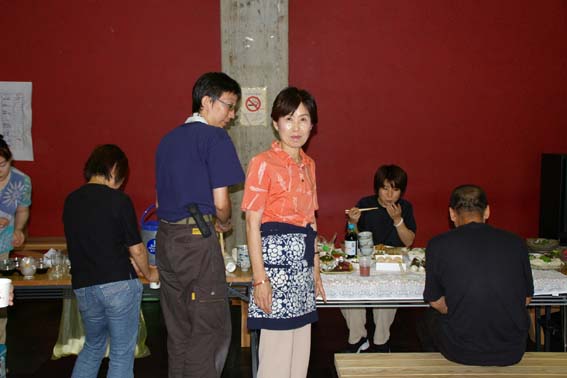 | ◆第89回例会報告 7月12日(木)第89回例会 木山事務所「壁の中の妖精」が行われました。 ★7月12日 午前11時搬入開始です。 トラック1台がすでに来ていました。 さあ ここに搬入します。 搬入作業が始まりました。大勢の会員さんが参加してくれました。 搬入作業は30分ほどで終了です。 ★打ち合わせ 制作の松本さん ★午後1時30分 「お通し」の準備が出来ました。 豪華な「お通し」です。ご苦労様でした。越智さん 劇団の皆さん たいへん喜んでくださいました。 デザートにコーヒーゼリーまで・・・ もちろん手作りです。 3時30分 最後に ピアノの伊藤弘一さん(前側左) とご一緒に・・・ ★午後5時 担当サークルのみなさん 作業が始まっていました。 ★5時50分ミーティング開始です。 司会は堀田さん 「担当サークルで2名増、前例会のクリアは残念ながらできませんでした。」! 演出助手の福原さんから「この芝居の感動を次の活動につなげてください。」 じゃんけんで勝った人はサイン色紙がもらえました。おめでとうございます。 ★6時 開場です。 わらじを売る 小野さん↓ ★6時30分開演です。 ズバリ!春風ひとみ!に拍手!! 物語は 30年間自宅の中で隠れて暮らした夫を支えた妻と子の話。 彼女の知恵と勇気、そしてわずかな幸運が夫を 家族を救い、かつ成功させた。 「生きるってすばらしい。」劇中何度か歌われる。 春風ひとみさん自身が 生きることを、そしてこの舞台で歌うことを そのものが すばらしいと聞こえました。 春風さんの演技は 完成されていて、 全てのしぐさ、まなざし、踊り、歌 全ての芝居に無駄が無くそしてリアル。 なるほど完璧な演技とはこういうものか。 それから、影絵の物語が、スペインの風土を表現していて、面白い演出だと思いました。 すばらしい時間をありがとう。すばらしい感動をありがとう。 カーテンコールは 拍手!拍手! 影絵のお人形さんも別れのキッスをくれました。 幕間に スペインの時代背景を見るみなさん ★8時55分 終演です。 搬出作業は どんどん進み・・・・。 ★10時終了です。 きれいにかたづいた舞台 みなさんご苦労様でした。 |