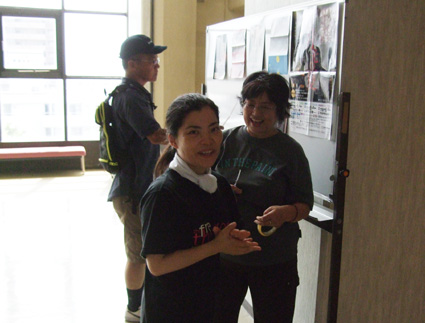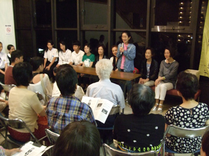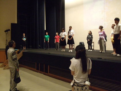 | ◆第118回例会報告 夏の会公演「夏の雲は忘れない」が7月23日(月) に行われました。 会場は今治市中央公民館です。 ★午前10時25分です。 今治駅 にスタッフさん お迎えに行きました。 制作?世話係りの藤島琴弥さん と 幹事の村上さん ★午前11時 中央公民館横 トラックがすでに到着しています。 搬入も始まっていました。 朗読劇ですが 照明と音響の設備は持ち込みです。 ○地元出演者の朗読指導係りの かねこあずみ さん(↓中央) ★11時30分 搬入終わり お世話係りの 藤島琴美さん と打ち合わせです。 ★ 午後2時35分 女優さんたちのお迎えです。 日色さんが 地元マイタウン紙の取材に応じてくれています。 ★午後5時 ご挨拶(対面式) 一年前 岡山での公演を見て、すぐ今治公演をお願いしました。 ★午後5時30分 ロビー 会場準備が進んでいます。 ★午後6時 開場です。 ★午後6時30分 開演です。 朗読劇です。 激しい演出や、美しい音楽が有る訳ではありません。 じっくり、しっとりと、言葉が伝わります。 あの時生きていた人たちの声になって・・・。 伝えるということは、簡単ではないのです。 困難なことかもしれない。 でも、あきらめない。 あなたなら、必ずできます。 だいじょうぶ、あなたたちならできます。 子供たちは (招待)11名 観に来てくれました。 きっと、心に響いてくれたと信じています。 ★午後8時 終演後すぐに 交流会が始まりました。 左から、神保共子さん、寺田路恵さん、大原ますみさん、日色ともゑさん、長内美那子さん、川口敦子さん 交流会 司会は酔芙蓉 古田さんです。 20分ほどで 交流会終了です。 搬出もあっという間に終わりました。 ★午後9時 作業は終了です。ご苦労様でした! |