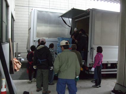 荷下ろしのスペースも小さいこの会場は・・・明日の搬出作業が恐ろしい。